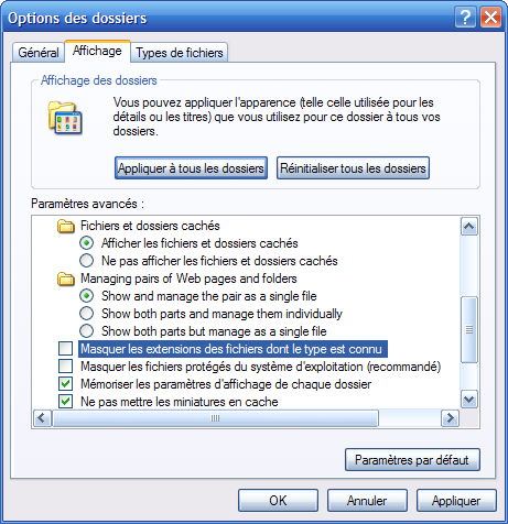 Dans l'onglet « Affichage », faites défiler la liste d'à peu près 8 lignes pour faire apparaitre la case à cocher « Masquer les extensions des fichiers dont le type est connu ». Cocher cette case, valider avec « OK » et voilà :